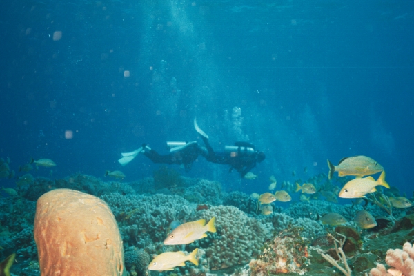 2 divers over reef